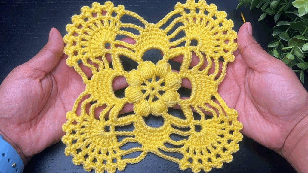 - Blocking: For an “incredible” result, blocking is essential. The combination of post stitches and the heavy corner definition means the square will be slightly warped before blocking. Wet the square, pin the corners firmly, and allow it to dry completely to define the sharp geometry and make the starburst texture truly pop.