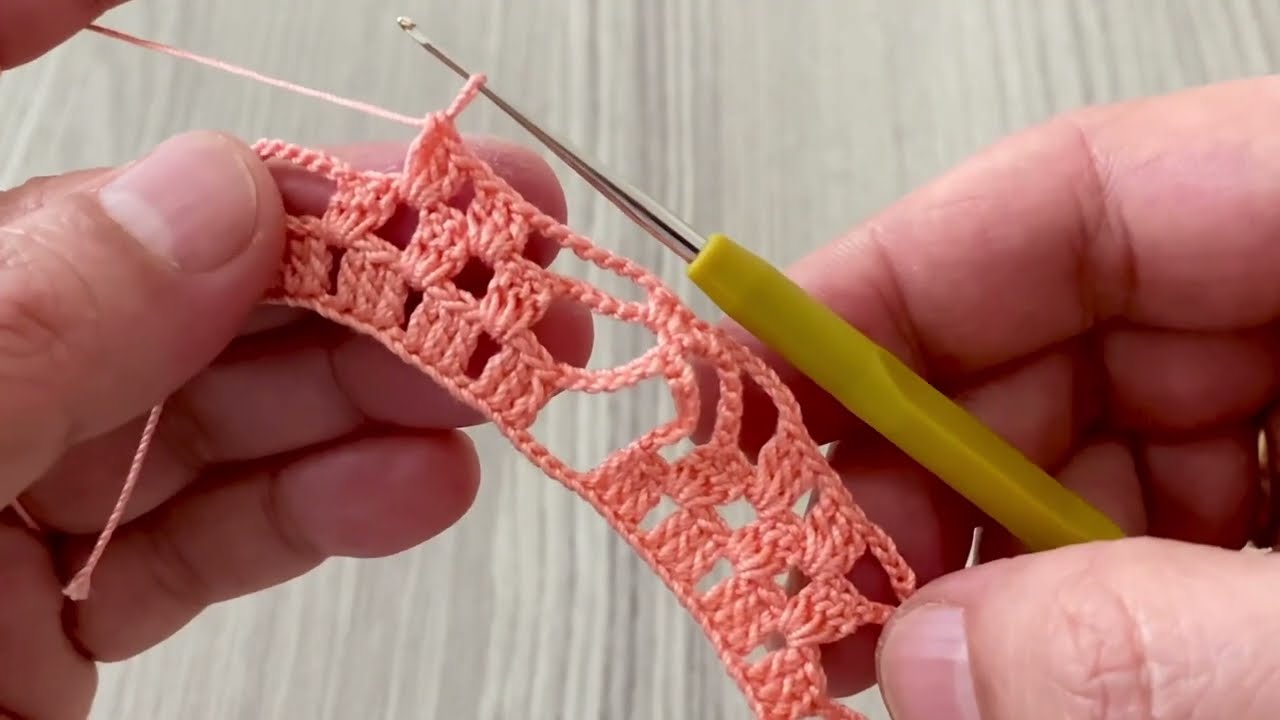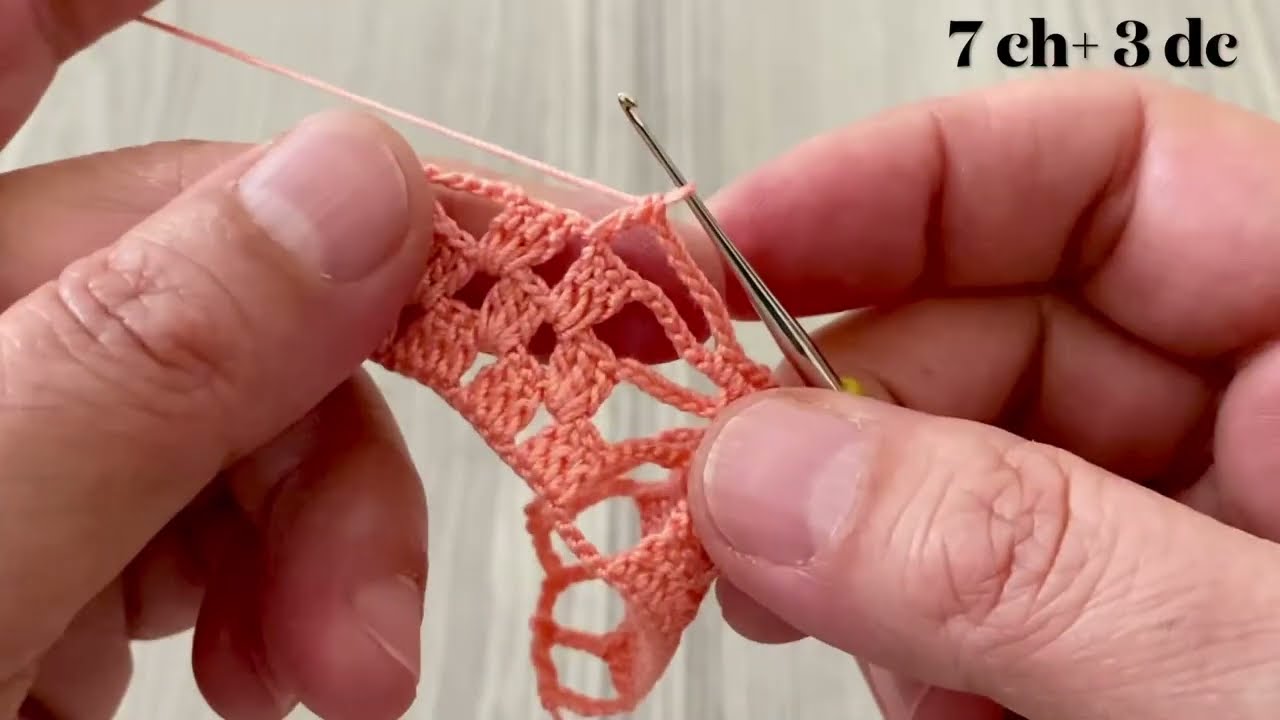- Repeat: [Skip 1 st, dc in the next st, ch 1] across the side until you reach the corner.