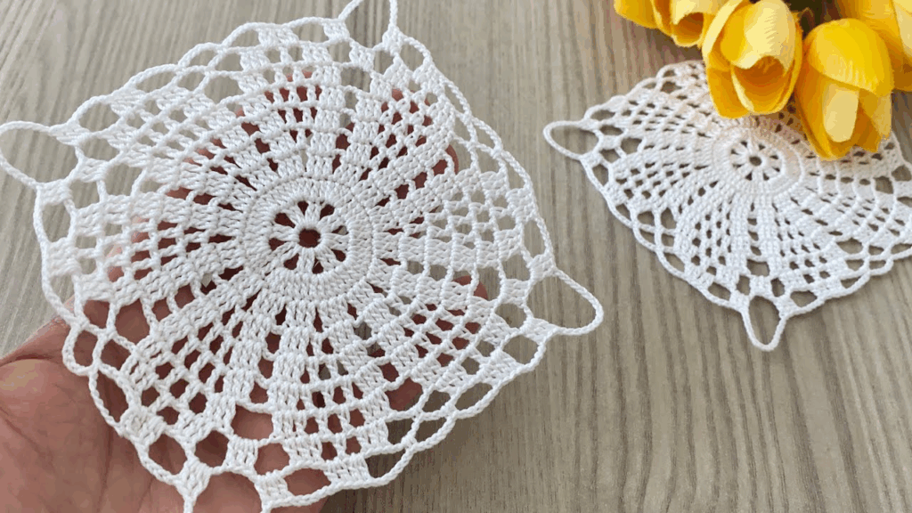 - Repeat: Continue the sequence [ch 1, Corner (3 dc, ch 2, 3 dc) in the next ch-2 corner sp, ch 1, 3 dc in the next ch-1 separator sp] 5 more times.