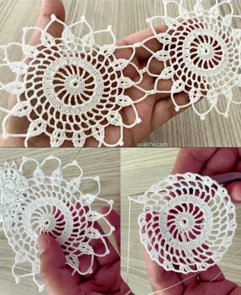 • Picot Peak Join: Instead of the regular Picot (ch 3, sl st), work ch 1, sl st into the Picot peak of the finished motif, ch 1, sl st into the first ch of the current Picot.
