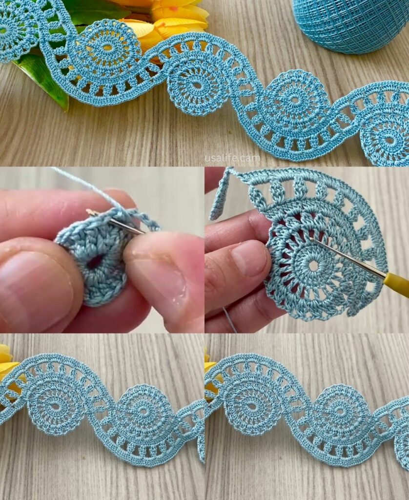 If you used thread, blocking (wetting and pinning the edge) is crucial to define the scallops and picots. If you used yarn, a gentle steam press will help the lace lie flat and smoothly follow the curve of the fabric.