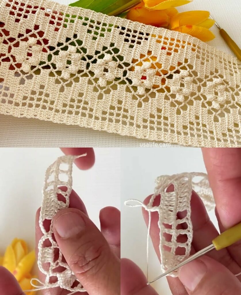 • Construction: Work the pattern in straight rows until the piece reaches the desired length (Scarf: 60-80 inches; Runner: Table length).