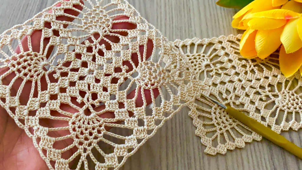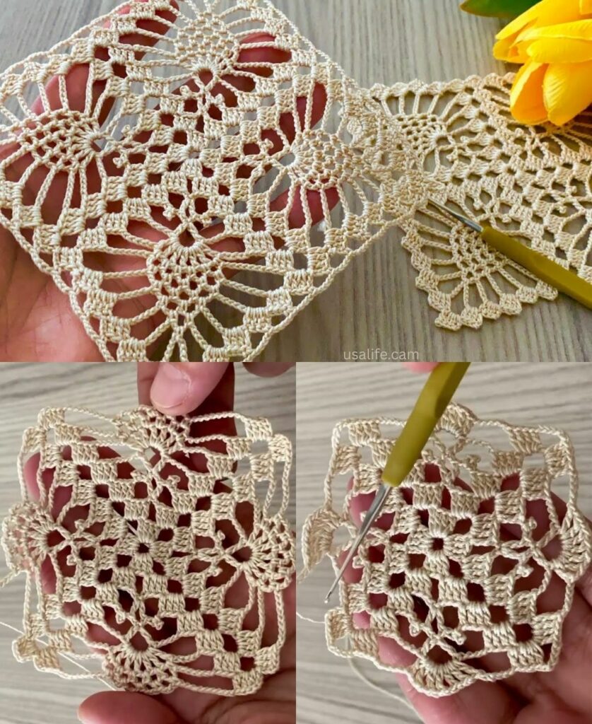 This “Pineapple Star Square” is stylish because it features four small pineapples pointing toward the corners, creating a beautiful geometric explosion from the center.