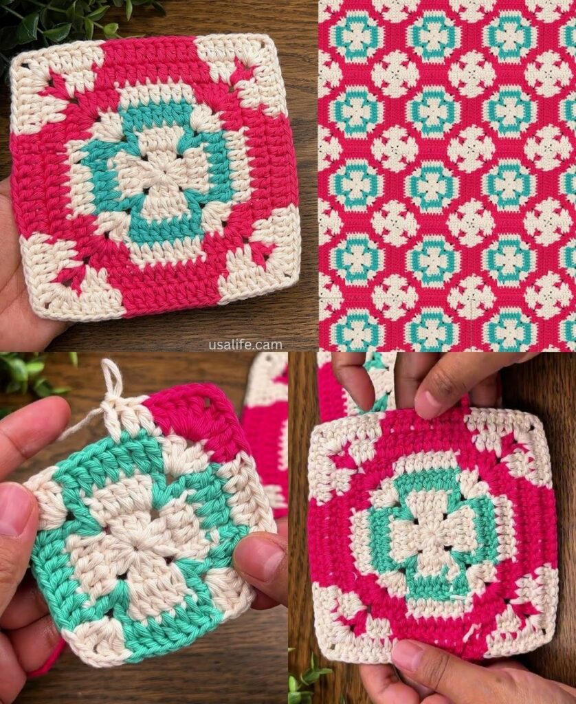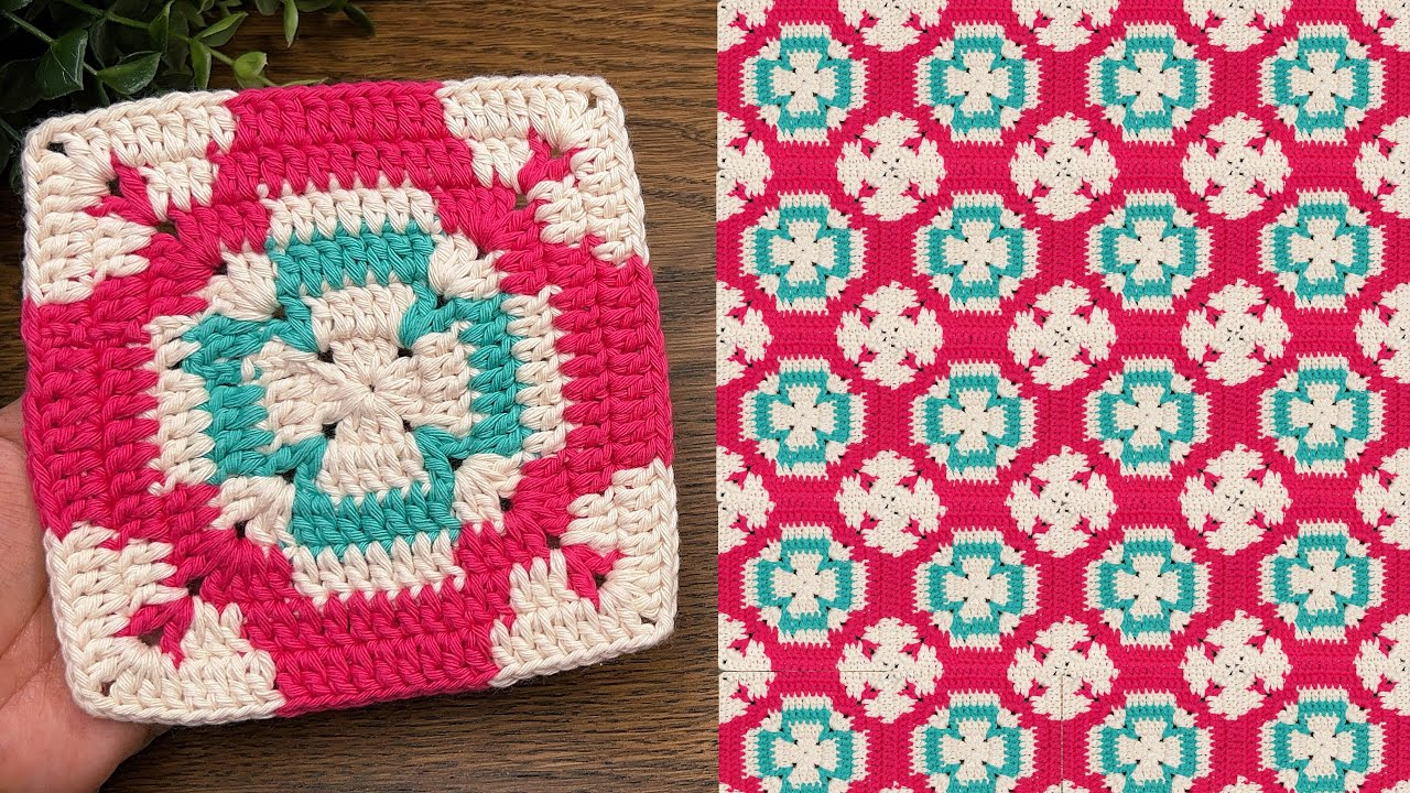 This motif is worked in 5 rounds. It starts as a circle and uses “stitch height manipulation” to become a perfect square.